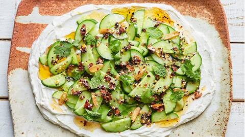 Salad ini menggabungkan mentimun segar dengan yogurt sebagai sausnya. Potong mentimun tipis-tipis, lalu campurkan dengan yogurt tawar, sedikit garam, dan perasan lemon. Tambahkan daun mint cincang untuk aroma segar. Salad ini tidak hanya menyegarkan tetapi juga memberikan sensasi creamy dari yogurt yang menyejukkan.