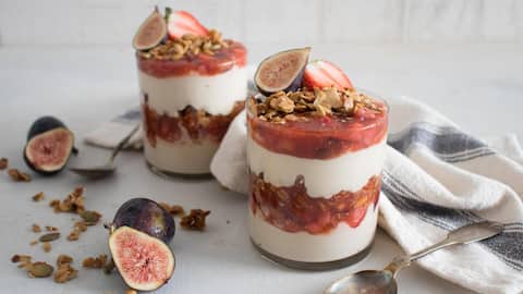 Yogurt parfait dengan lapisan yogurt dan potongan buah ara segar, granola renyah, serta taburan kacang almond adalah pilihan sarapan bergizi tinggi atau pencuci mulut sehat. Susun bahan-bahan tersebut dalam gelas transparan agar terlihat menarik saat disajikan. Kombinasi tekstur lembut yogurt, renyah granola, serta manisnya buah membuat parfait ini sangat menggugah selera.