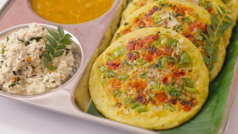 Uttapam adalah panekuk tebal yang terbuat dari adonan beras fermentasi dan lentil hitam. Biasanya dihiasi dengan sayuran seperti bawang, tomat, dan cabai hijau di atasnya sebelum dimasak. Uttapam memiliki tekstur lembut di dalam namun renyah di luar, menjadikannya pilihan sarapan yang mengenyangkan.